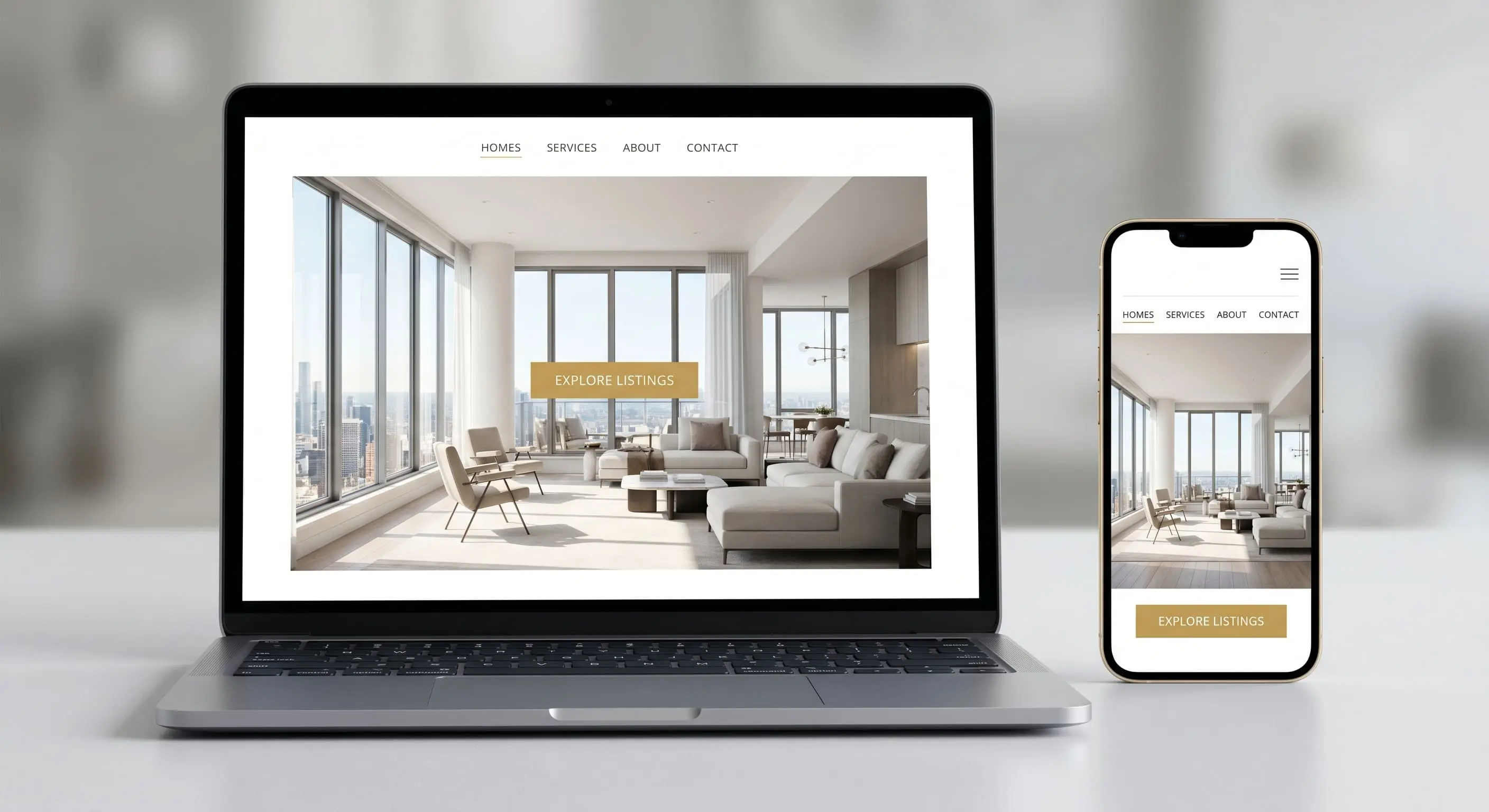Modernes Makler-Website-Design auf Laptop und Smartphone — minimalistisch mit großflächigen Immobilienfotos